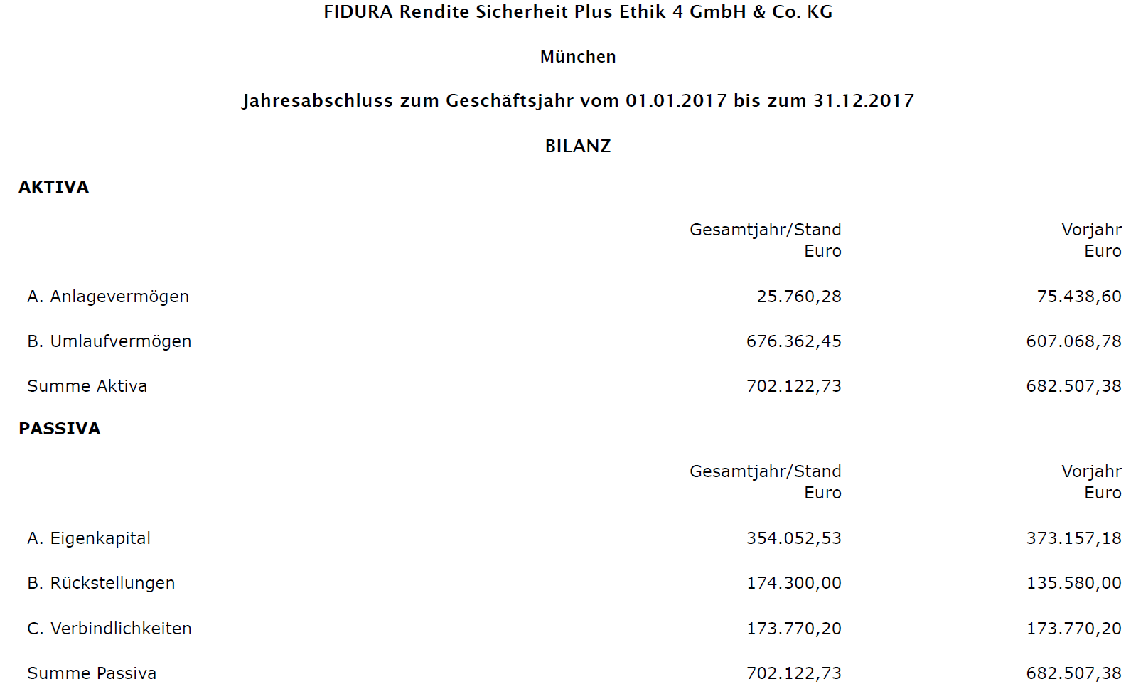 Zum FIDURA Rendite Sicherheit Plus Ethik 4 GmbH & Co. KG wurden zum 31.12.2017 folgende Fakten veröffentlicht: